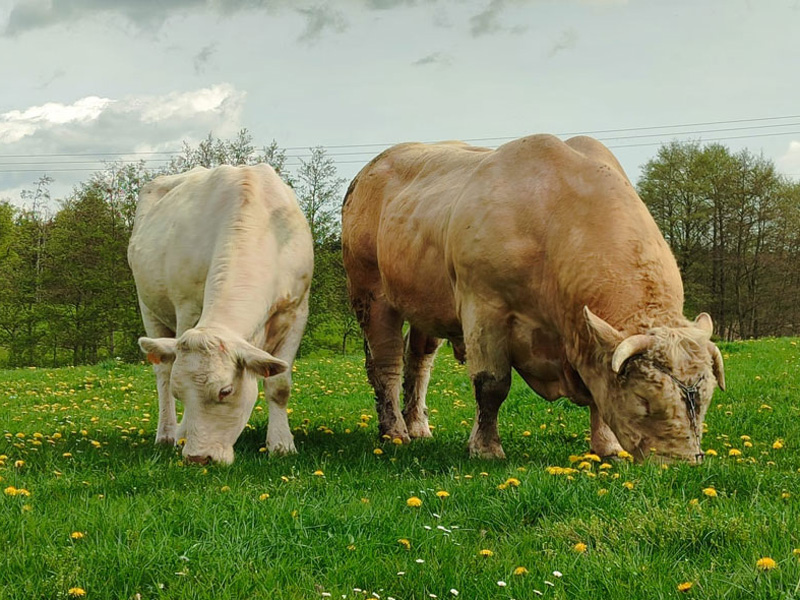 Glücklich und Gesund leben unsere 100 Charolais, davon 40 Mutterkühe und 3 Zuchtbullen auf einer Weidefläche von ca. 50 ha in natürlicher Freilandhaltung.